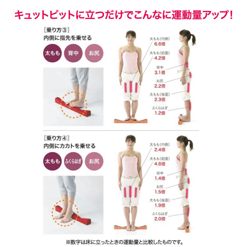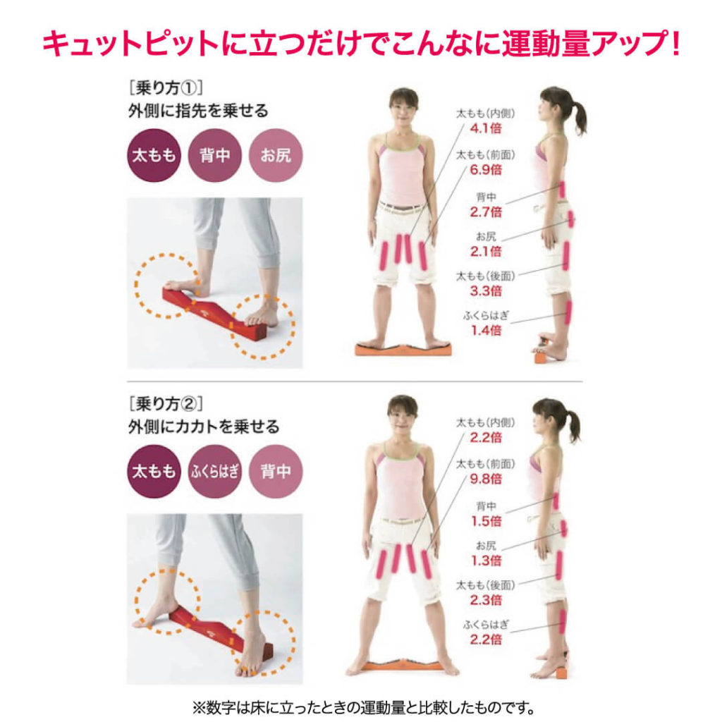 キュットピットの効果を検証した結果、床に立った時と比較して下半身の筋肉の運動量が増加しています。太ももの前面の運動量はなんと9.8倍までアップしました。